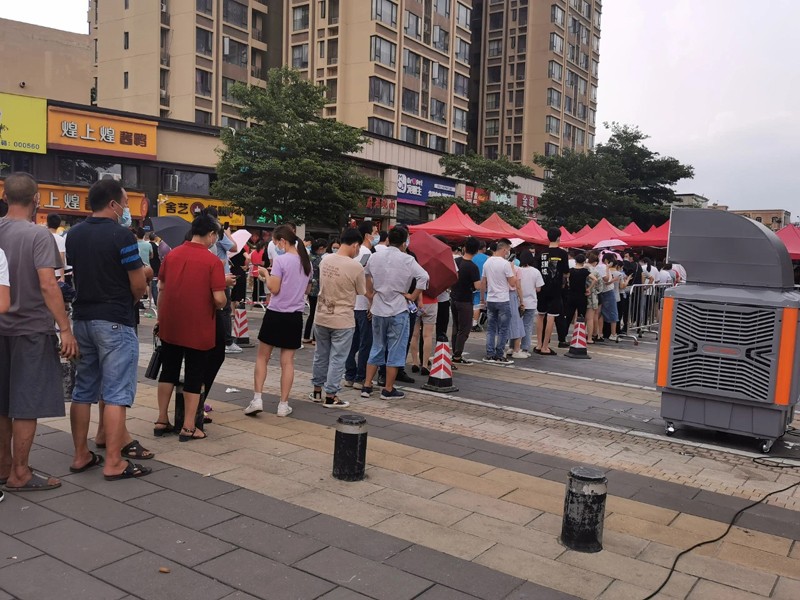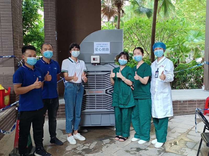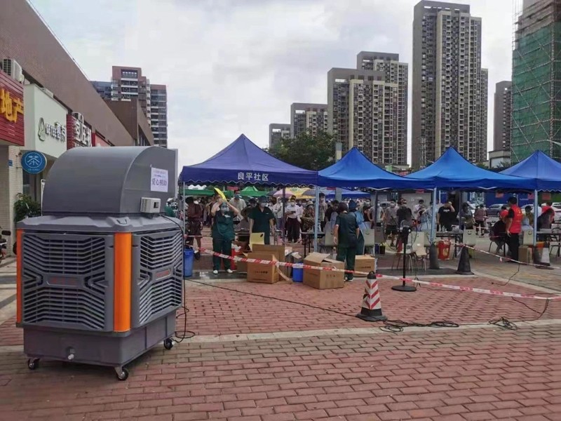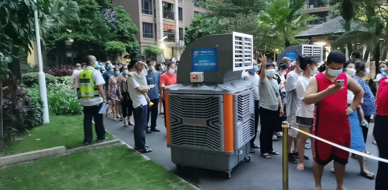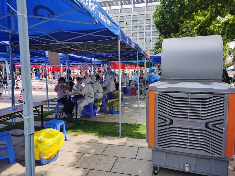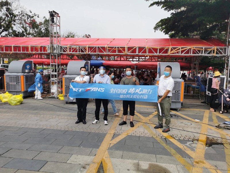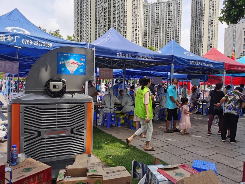 今日夏至,天氣炎熱,酷暑難耐,東莞市與健康搶時間,組織進(jìn)行了大范圍的核酸檢測。為了市民的健康安危,可是辛苦了白衣天使們,現(xiàn)場有醫(yī)護(hù)人員直接因高溫難耐而暈倒!聽聞今天高溫,戶外檢測點面臨嚴(yán)峻的高溫挑戰(zhàn),廣東瑞泰公司、瑞泰風(fēng)關(guān)愛在行動組委會立即行動,組織生產(chǎn)下線了一批次的瑞泰風(fēng)移動冷風(fēng)機(jī),因為檢測點多是臨時場地,擔(dān)心電源取電不便,出廠前特別加長了設(shè)備的電源線與特別配備了加水軟管,后在瑞泰風(fēng)東莞多支愛心團(tuán)隊的落地服務(wù)下,分多路迅速送達(dá)東莞萬江,南城,寮步,石碣,以及松山湖的大型核酸檢測點,希望為一線醫(yī)護(hù)人員和排隊的人民群眾,送去一絲清涼。